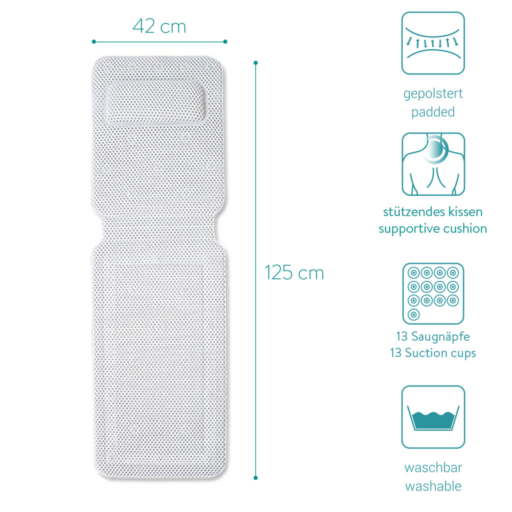 Saltea baie Navaris, 125x42 cm, perna pentru cada cu 13 ventuze antiderapante, alb, poliester